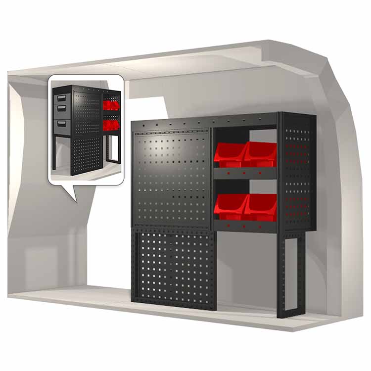 Dieses Einrichtungssystem wurde entworfen, um optimale Passgenauigkeit und bestmögliche Funktionalität und Sicherheit zu gewährleisten. Es ist für den professionellen Gebrauch entwickelt worden, ist flexibel und zur Anwendung in verschiedenen Geschäftsbereichen bestimmt. Universal- und Bodenwinkel sind enthalten.