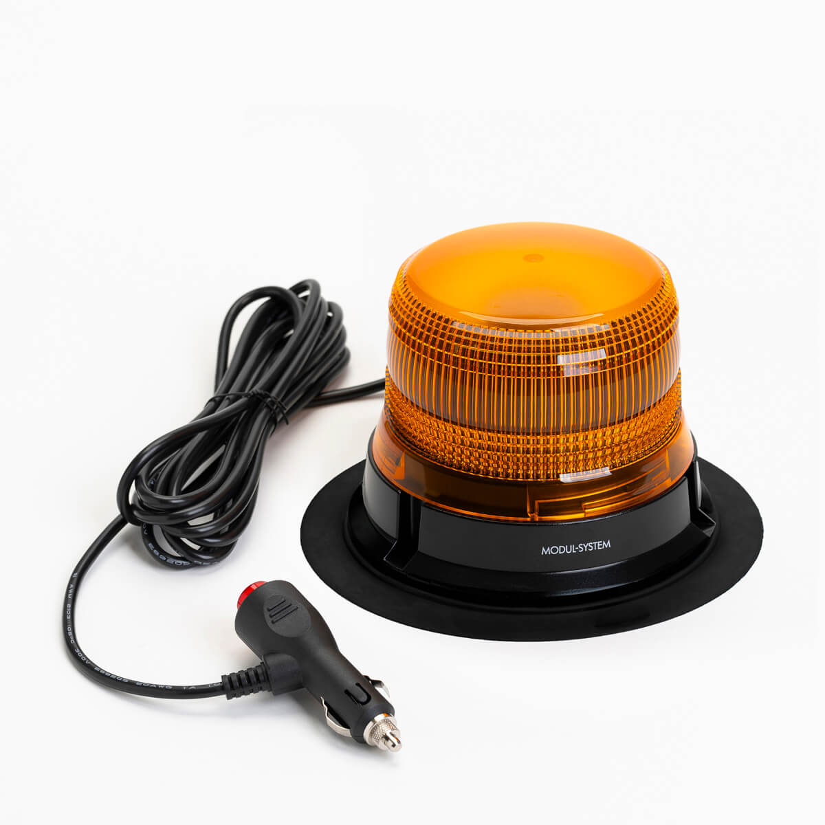 Premium-Rundumleuchte mit Magnetfuß für die temporäre oder stationäre Installation. Die Leuchte wird über das montierte Kabel und den Zigarettenanzünder mit Strom versorgt.