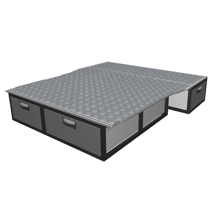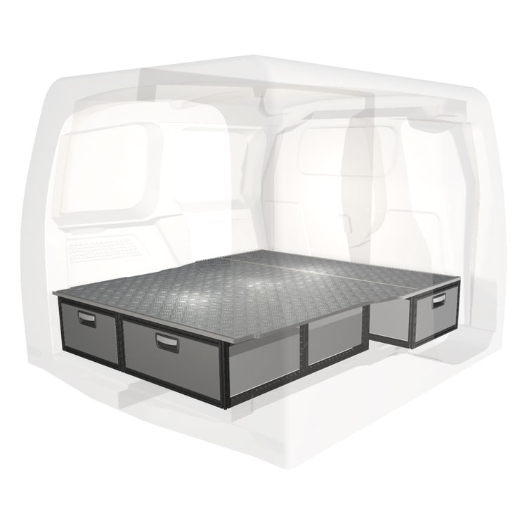 The kit is designed to be fitted on top of a wooden floor. The double floor is equipped with rails for easy installation of vehicle racking, and edging strips for a nice finish.
