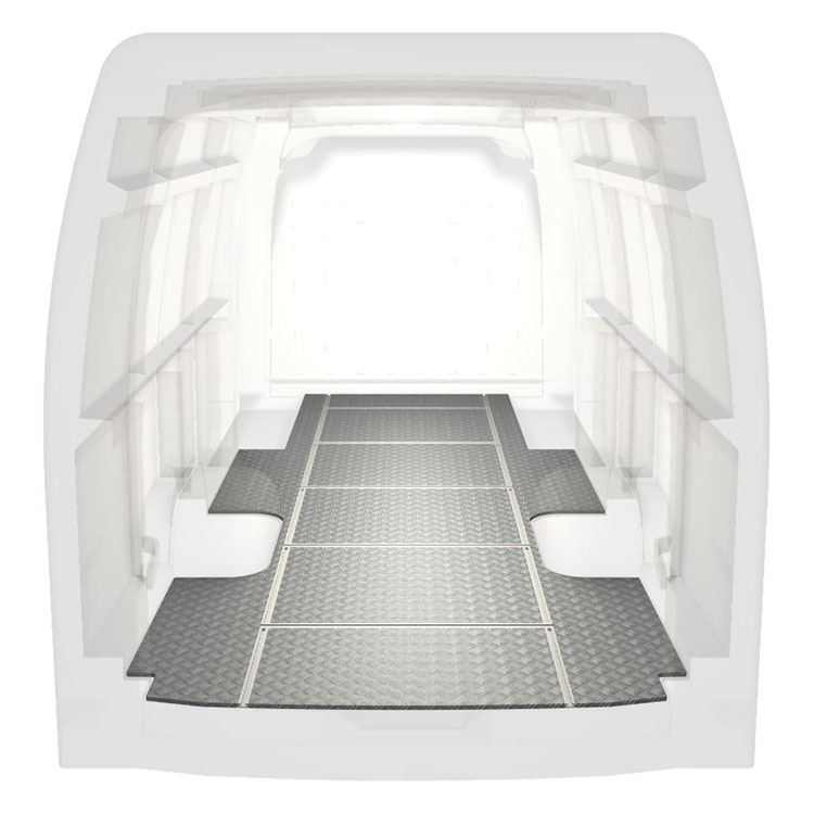 Leichte und robuste Fahrzeugböden mit Querschienen für einen Renault Master / Opel Movano / Nissan NV400 werden mit einem rutschfesten Trittblech aus Aluminium und Schienen (längs und quer) für eine schnelle und sichere Montage von Regalsystemen und anderem Zubehör geliefert.
