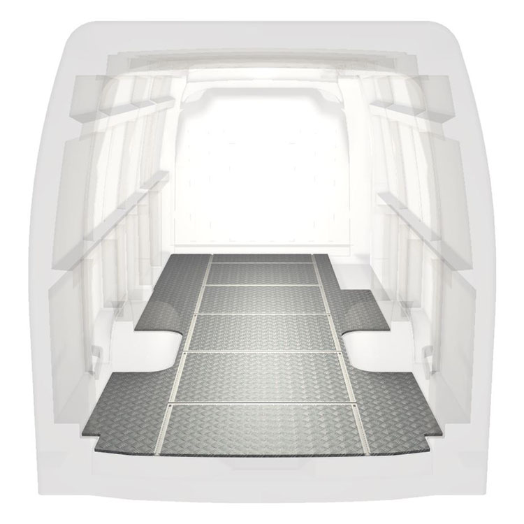 Leichte und robuste Fahrzeugböden mit Querschienen für einen Renault Master / Opel Movano / Nissan NV400 werden mit einem rutschfesten Trittblech aus Aluminium und Schienen (längs und quer) für eine schnelle und sichere Montage von Regalsystemen und anderem Zubehör geliefert.