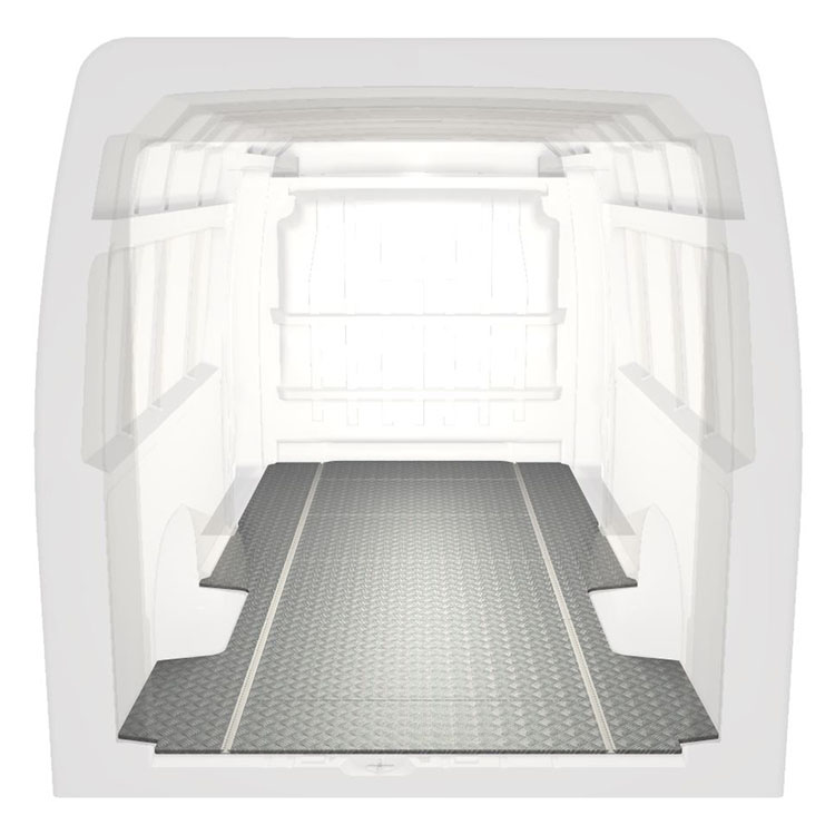 Leichte und robuste Standard-Fahrzeugböden für einen Citroën Jumper / Peugeot Boxer / Fiat Ducato werden mit einem rutschfesten Trittblech aus Aluminium und Schienen (längs) für eine schnelle und sichere Montage von Regalsystemen und anderem Zubehör geliefert.