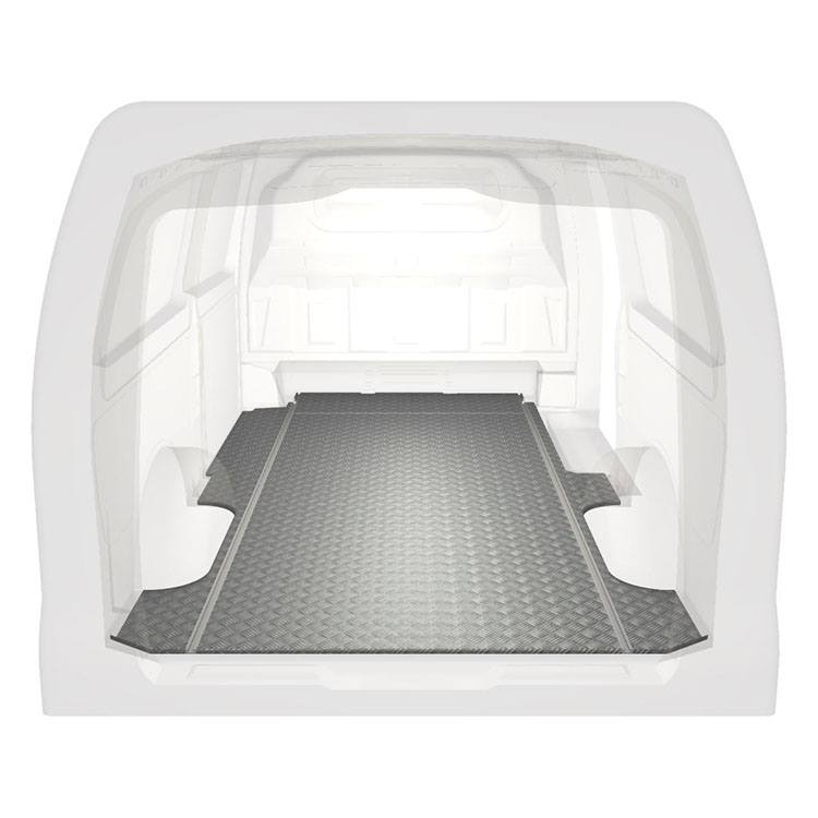 Leichte und robuste, extra lange Böden für einen Mercedes Vito werden mit einem rutschfesten Trittblech aus Aluminium und Schienen (längs) für eine schnelle und sichere Montage von Regalsystemen und anderem Zubehör geliefert.