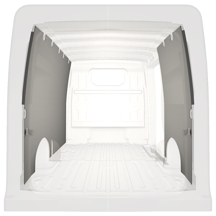 Leichte Vollverkleidung für die Innenwände eines Volkswagen Crafter / MAN TGE mit Seitentür rechts.Die Verkleidungen schaffen ein helles und angenehmes Arbeitsumfeld und sind leicht zu reinigen.