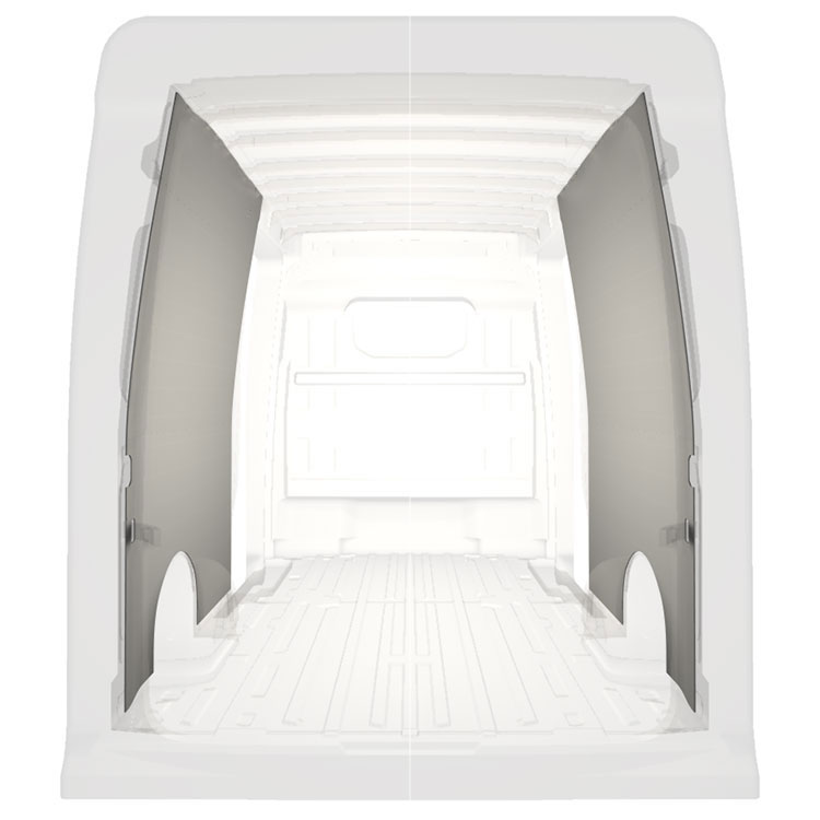 Leichte Vollverkleidung für die Innenwände eines Volkswagen Crafter / MAN TGE mit beidseitigen Seitentüren. Die Verkleidungen schaffen ein helles und angenehmes Arbeitsumfeld und sind leicht zu reinigen.