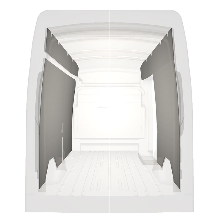 Leichte Vollverkleidung für die Innenwände eines Ford Transit mit Seitentür rechts.Die Verkleidungen schaffen ein helles und angenehmes Arbeitsumfeld und sind leicht zu reinigen.