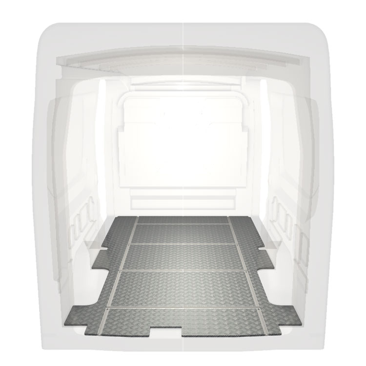 Leichte und robuste Fahrzeugböden mit Querschienen für einen Ford Transit werden mit einem rutschfesten Trittblech aus Aluminium und Schienen (längs und quer) für eine schnelle und sichere Montage von Regalsystemen und anderem Zubehör geliefert.