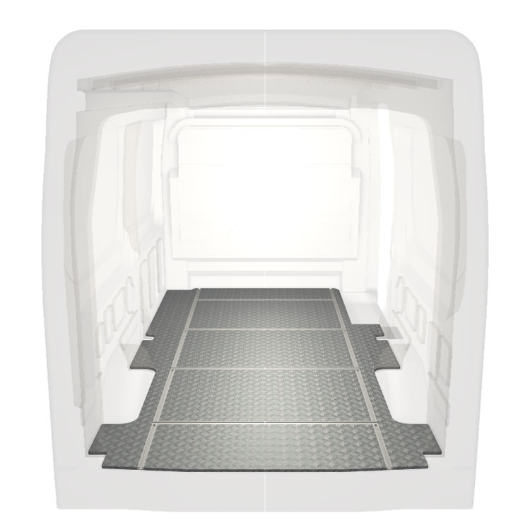Leichte und robuste Fahrzeugböden mit Querschienen für einen Ford Transit werden mit einem rutschfesten Trittblech aus Aluminium und Schienen (längs und quer) für eine schnelle und sichere Montage von Regalsystemen und anderem Zubehör geliefert.