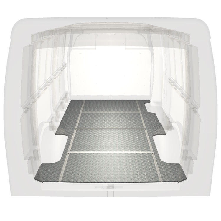 Leichte und robuste Fahrzeugböden mit Querschienen für einen Iveco Daily werden mit einem rutschfesten Trittblech aus Aluminium und Schienen (längs und quer) für eine schnelle und sichere Montage von Regalsystemen und anderem Zubehör geliefert.