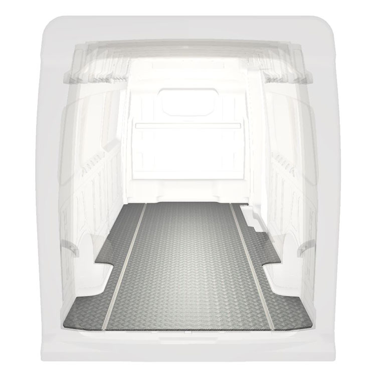 Leichte und robuste, extra lange Böden für einen Volkswagen Crafter / MAN TGE werden mit einem rutschfesten Trittblech aus Aluminium und Schienen (längs) für eine schnelle und sichere Montage von Regalsystemen und anderem Zubehör geliefert.