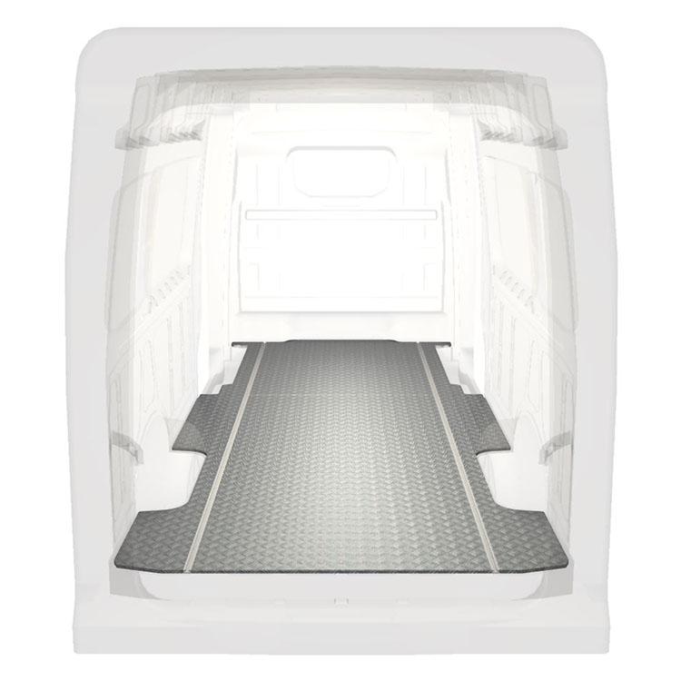 Leichte und robuste, extra lange Böden für einen Volkswagen Crafter / MAN TGE werden mit einem rutschfesten Trittblech aus Aluminium und Schienen (längs) für eine schnelle und sichere Montage von Regalsystemen und anderem Zubehör geliefert.