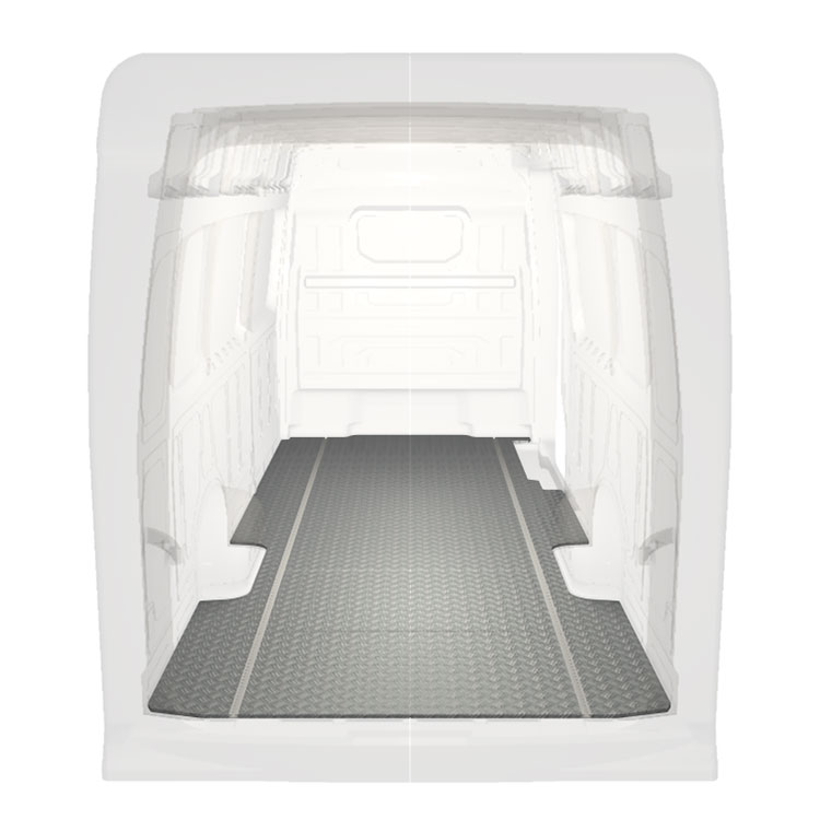 Leichte und robuste Standard-Fahrzeugböden für einen Volkswagen Crafter / MAN TGE werden mit einem rutschfesten Trittblech aus Aluminium und Schienen (längs) für eine schnelle und sichere Montage von Regalsystemen und anderem Zubehör geliefert.