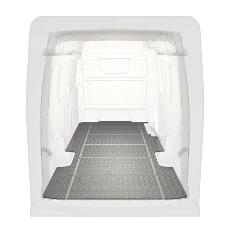 Leichte und robuste Fahrzeugböden mit Querschienen für einen Volkswagen Crafter / MAN TGE werden mit einem rutschfesten Trittblech aus Aluminium und Schienen (längs und quer) für eine schnelle und sichere Montage von Regalsystemen und anderem Zubehör geliefert.