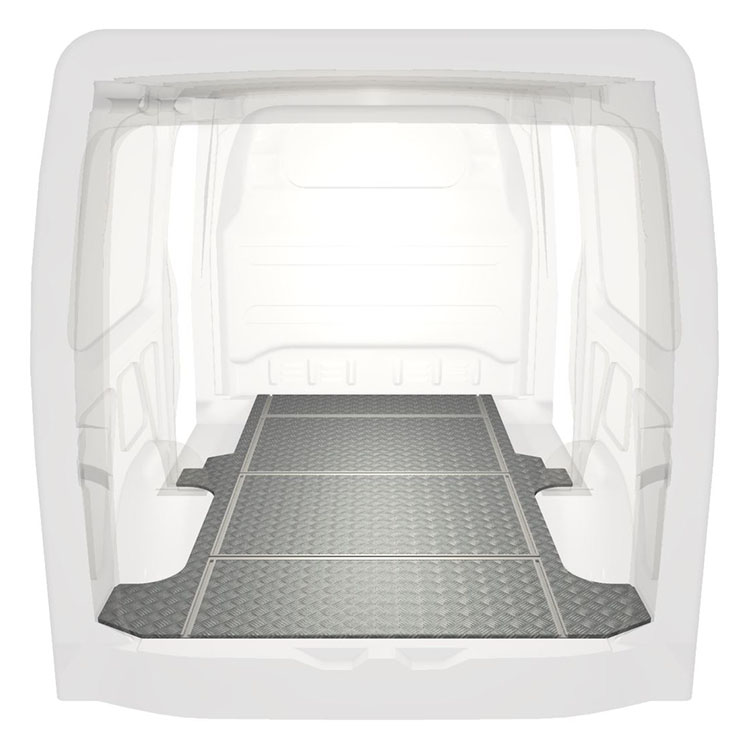 Leichte und robuste Fahrzeugböden mit Querschienen für einen Mercedes Sprinter werden mit einem rutschfesten Trittblech aus Aluminium und Schienen (längs und quer) für eine schnelle und sichere Montage von Regalsystemen und anderem Zubehör geliefert.