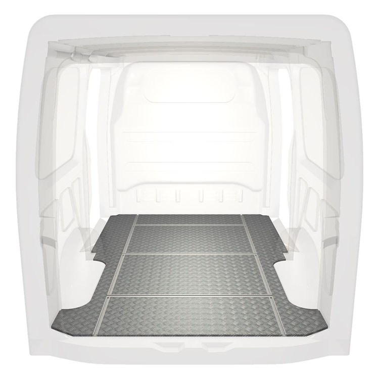 Leichte und robuste Fahrzeugböden mit Querschienen für einen Mercedes Sprinter werden mit einem rutschfesten Trittblech aus Aluminium und Schienen (längs und quer) für eine schnelle und sichere Montage von Regalsystemen und anderem Zubehör geliefert.