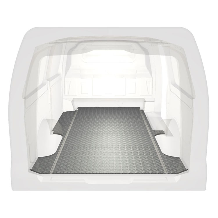Leichte und robuste Standard-Fahrzeugböden für einen Mercedes Vito werden mit einem rutschfesten Trittblech aus Aluminium und Schienen (längs) für eine schnelle und sichere Montage von Regalsystemen und anderem Zubehör geliefert.