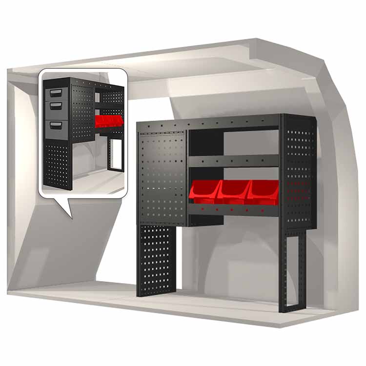 Dieses Einrichtungssystem wurde entworfen, um optimale Passgenauigkeit und bestmögliche Funktionalität und Sicherheit zu gewährleisten. Es ist für den professionellen Gebrauch entwickelt worden, ist flexibel und zur Anwendung in verschiedenen Geschäftsbereichen bestimmt. Universal- und Bodenwinkel sind enthalten.