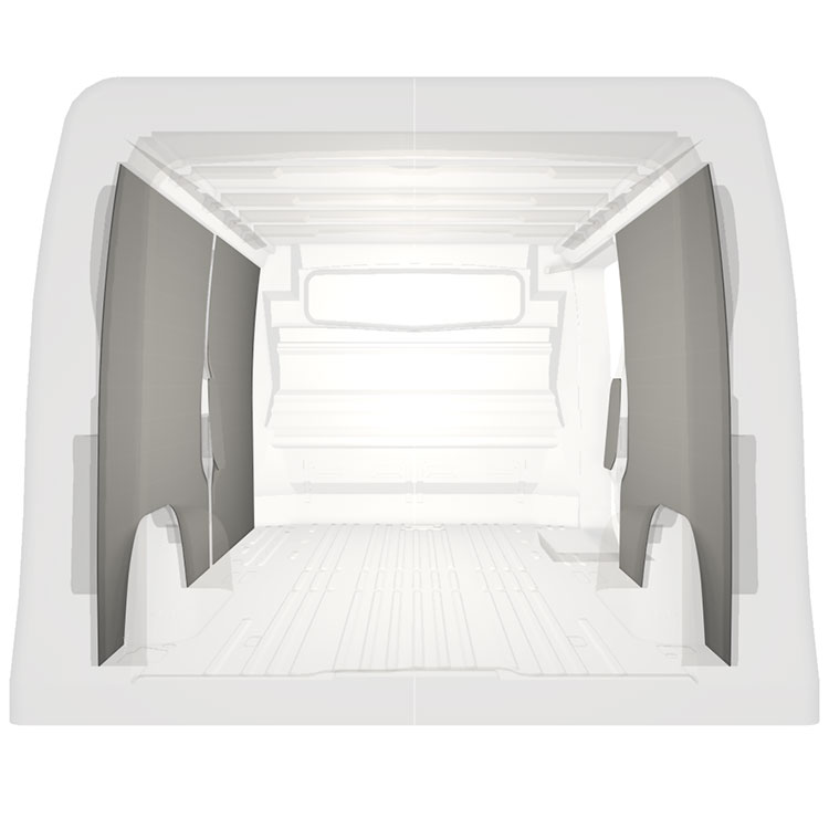 Leichte Vollverkleidung für die Innenwände eines Renault Trafic / Opel Vivaro / Fiat Talento / Nissan NV300 mit Seitentür rechts.Die Verkleidungen schaffen ein helles und angenehmes Arbeitsumfeld und sind leicht zu reinigen.