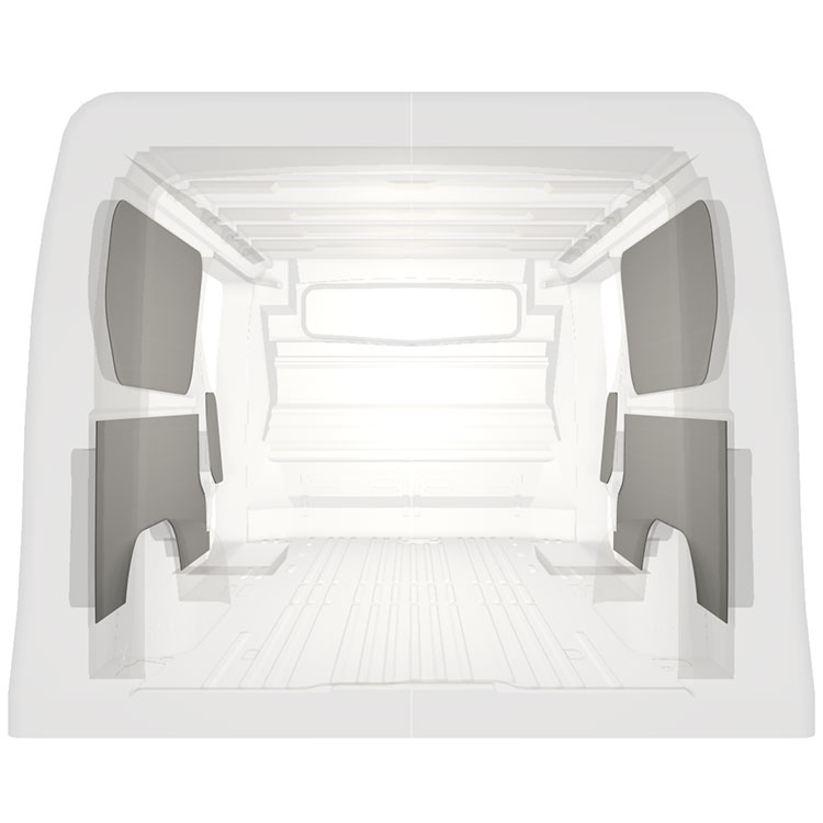 Leichte, zugeschnittene Verkleidung für die Innenwände eines Renault Trafic / Opel Vivaro / Fiat Talento / Nissan NV300 mit beidseitigen Seitentüren. Die Verkleidungen schaffen ein helles und angenehmes Arbeitsumfeld und sind leicht zu reinigen.