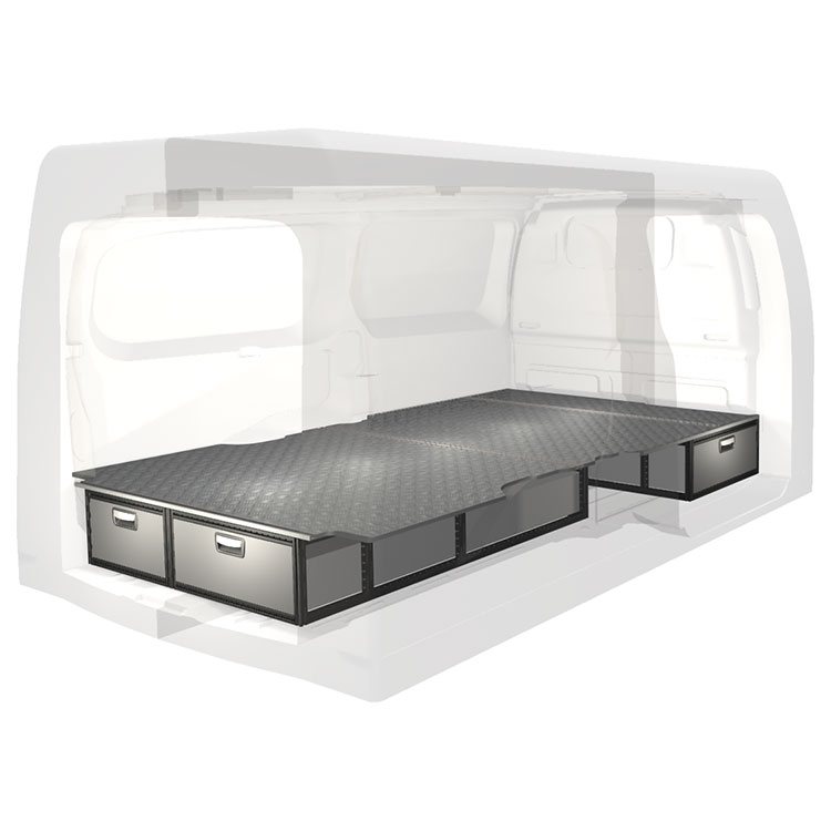 The kit is designed to be fitted on top of a wooden floor. The double floor is equipped with rails for easy installation of vehicle racking, and edging strips for a nice finish.