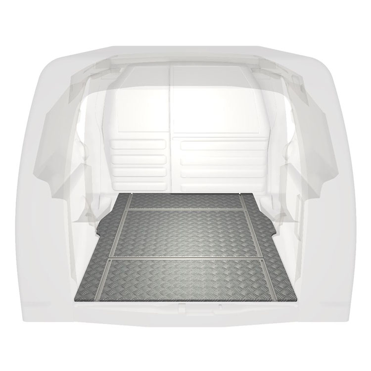 Leichte und robuste Fahrzeugböden mit Querschienen für einen Citroën Berlingo / Peugeot Partner werden mit einem rutschfesten Trittblech aus Aluminium und Schienen (längs und quer) für eine schnelle und sichere Montage von Regalsystemen und anderem Zubehör geliefert.