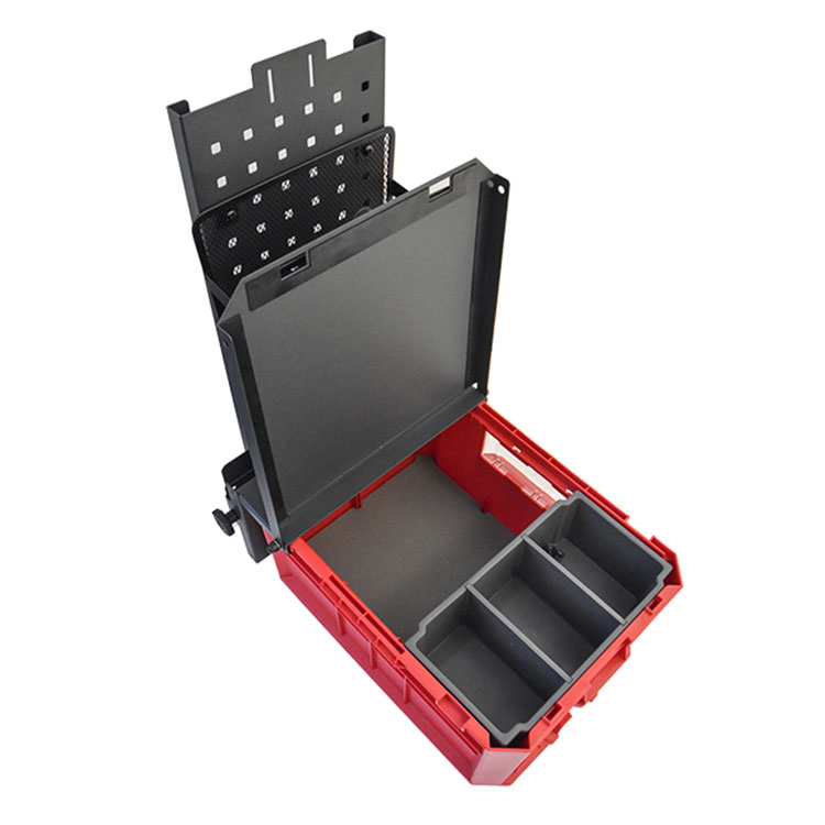 Das Mobile Office hat ein großes Fach zur Aufbewahrung und einen Deckel mit rutschfester Oberfläche. Im Lieferumfang sind eine Kunststoffauskleidung für die Basis, ein Einsatz für kleinere Geräte, ein Magnet zum Halten von Papieren und eine Aufbewahrungstasche enthalten.