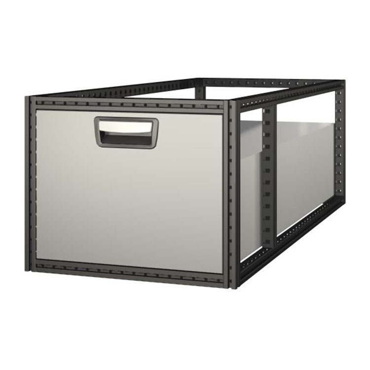 Die extralangen Schubladenmodule haben einen Rahmen aus ultrahochfestem Stahl und Schubladen aus Aluminium. Die Schubladen sind serienmäßig mit Kugellagern ausgestattet. Die Mischung aus festen und flexiblen Lagern macht sie sowohl stabil als auch einfach zu bedienen.