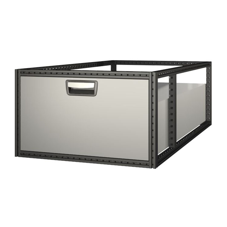 Die extralangen Schubladenmodule haben einen Rahmen aus ultrahochfestem Stahl und Schubladen aus Aluminium. Die Schubladen sind serienmäßig mit Kugellagern ausgestattet. Die Mischung aus festen und flexiblen Lagern macht sie sowohl stabil als auch einfach zu bedienen.