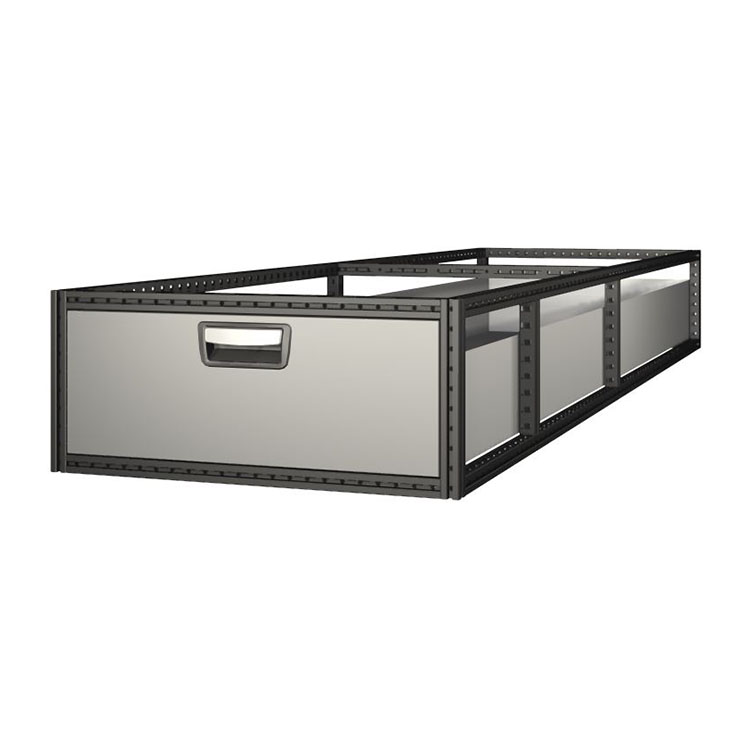 Die extralangen Schubladenmodule haben einen Rahmen aus ultrahochfestem Stahl und Schubladen aus Aluminium. Die Schubladen sind serienmäßig mit Kugellagern ausgestattet. Die Mischung aus festen und flexiblen Lagern macht sie sowohl stabil als auch einfach zu bedienen.