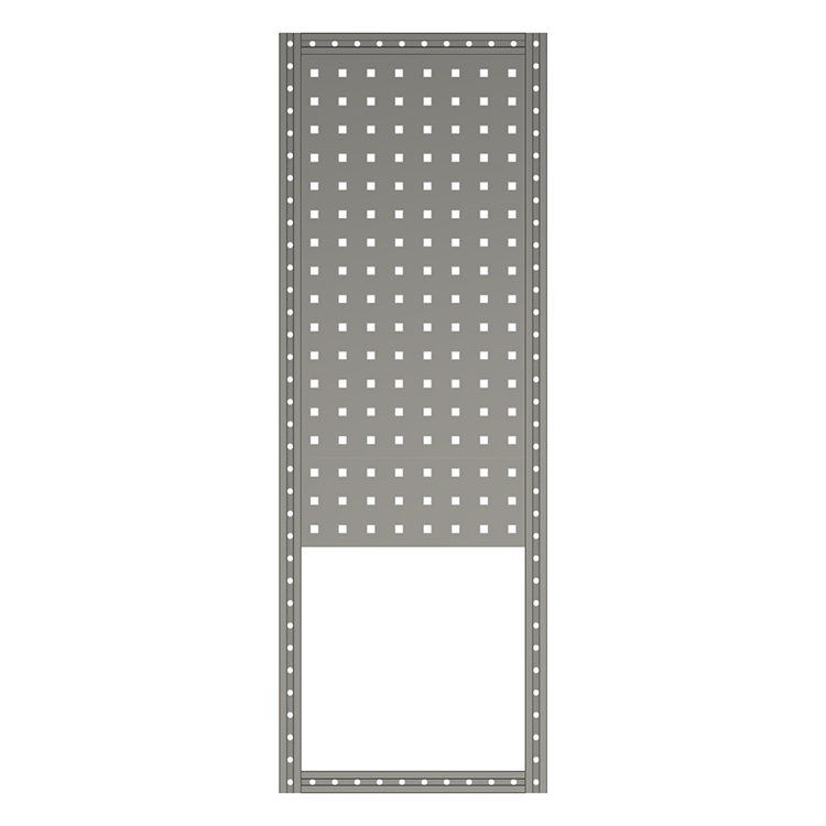 Regalseitenteil mit gekürtztem Lochblech zur Aufnahme, zum Beispiel eine ausziehbare Schraubstockhalter. Im Regalseitenteil ist eine T-Nut integriert, die sich zur Lastensicherung, Zubehörbefestigung sowie zur flexiblen Oberflächenmontage verwenden lässt.