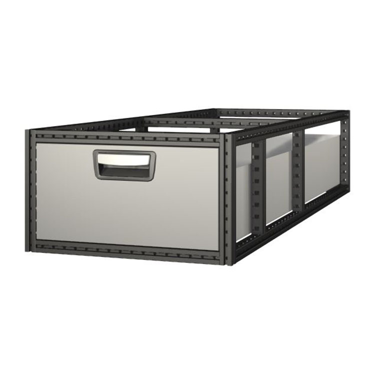 Die extralangen Schubladenmodule haben einen Rahmen aus ultrahochfestem Stahl und Schubladen aus Aluminium. Die Schubladen sind serienmäßig mit Kugellagern ausgestattet. Die Mischung aus festen und flexiblen Lagern macht sie sowohl stabil als auch einfach zu bedienen.