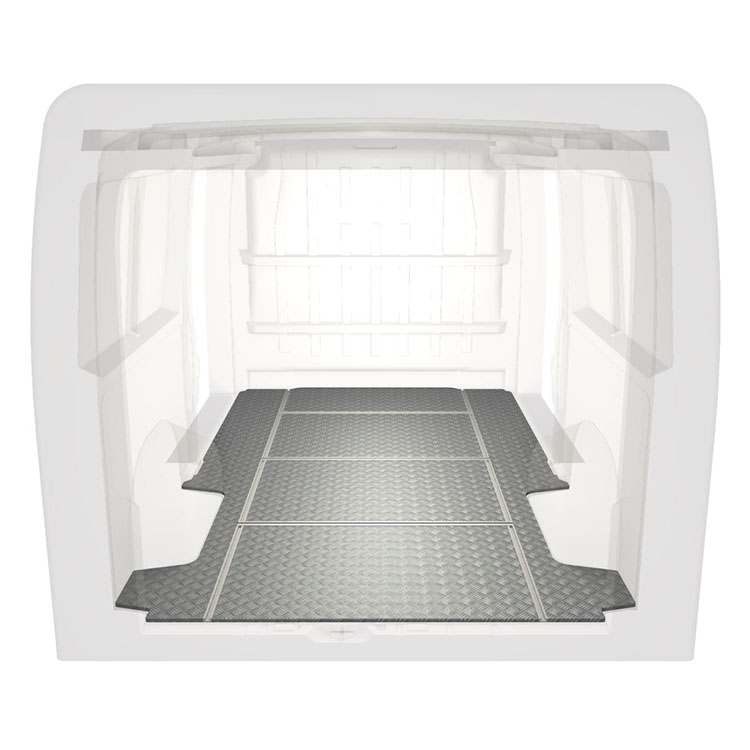 Leichte und robuste Fahrzeugböden mit Querschienen für einen Citroën Jumper / Peugeot Boxer / Fiat Ducato werden mit einem rutschfesten Trittblech aus Aluminium und Schienen (längs und quer) für eine schnelle und sichere Montage von Regalsystemen und anderem Zubehör geliefert.