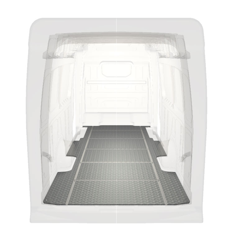Leichte und robuste Fahrzeugböden mit Querschienen für einen Volkswagen Crafter / MAN TGE werden mit einem rutschfesten Trittblech aus Aluminium und Schienen (längs und quer) für eine schnelle und sichere Montage von Regalsystemen und anderem Zubehör geliefert.