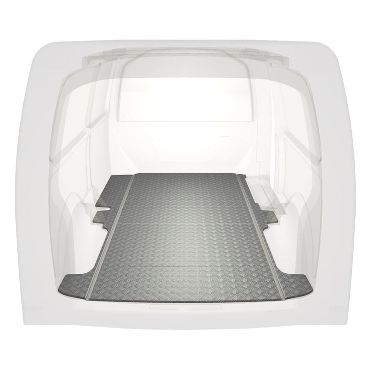 Leichte und robuste Standard-Fahrzeugböden für einen Volkswagen Transporter T6 werden mit einem rutschfesten Trittblech aus Aluminium und Schienen (längs) für eine schnelle und sichere Montage von Regalsystemen und anderem Zubehör geliefert.