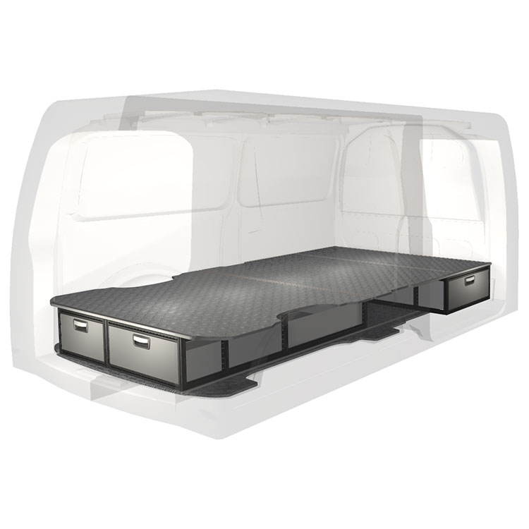 The kit is designed to be fitted on top of a Modul-Floor, utilizing the floor rails for a non-intrusive installation. The double floor is equipped with rails for easy installation of vehicle racking, and edging strips for a nice finish.