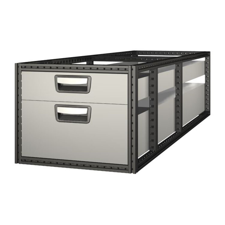 Les tiroirs extra-longs sont conçus pour les articles lourds et encombrants et ont une capacité de charge de 80 kg par tiroir, avec un maximum de 200 kg par bloc-tiroirs. En ajoutant une plaque de renfort caoutchoutée, la capacité de charge est portée à 100 kg. Les tiroirs peuvent être tirés sur environ 80 pour cent, et sont proposés avec des profondeurs jusqu’à 2 m. Vous pouvez les combiner librement pour les adapter à votre cargaison et à votre véhicule. Les tiroirs sont équipés de roulements à billes et d’un système CRP en standard. Celui-ci empêchera que les lourdes charges ne soient projetées vers l’avant en cas d’accident.