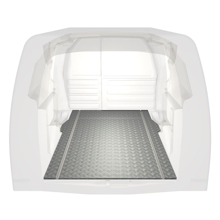 Plancher standard ultra-léger et robuste pour uneCitroën Berlingo / Peugeot Partner avec une plaque de roulement en aluminium antidérapant et des rails de chargement (longitudinaux) pour une installation rapide et sûre des systèmes de rayonnage et autres accessoires.
