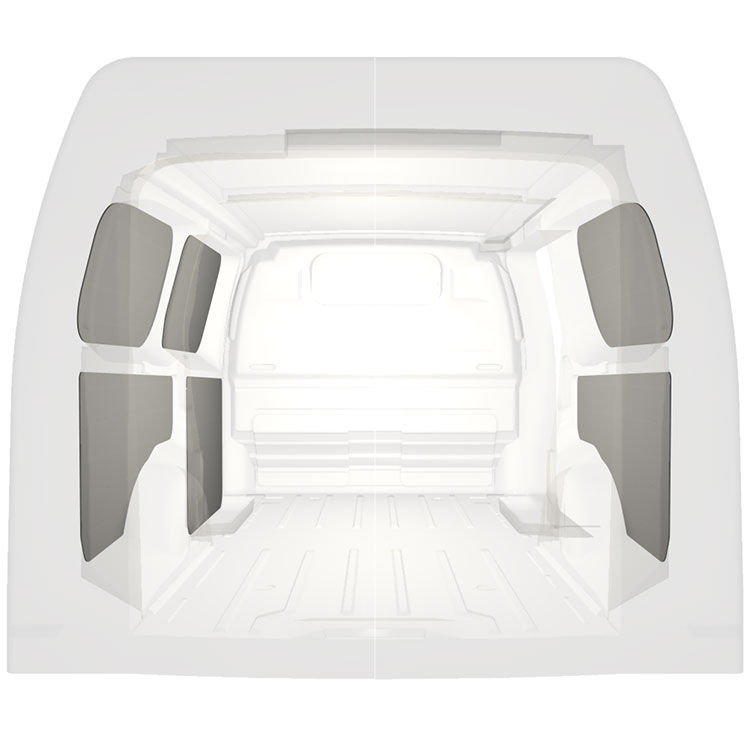 Revêtement de parois léger pour parois intérieures d’une Citroën Jumpy / Peugeot Expert / Toyota ProAce avec une porte latérale à droite. Les parois créeront un environnement professionnel lumineux et convivial et se nettoient facilement.