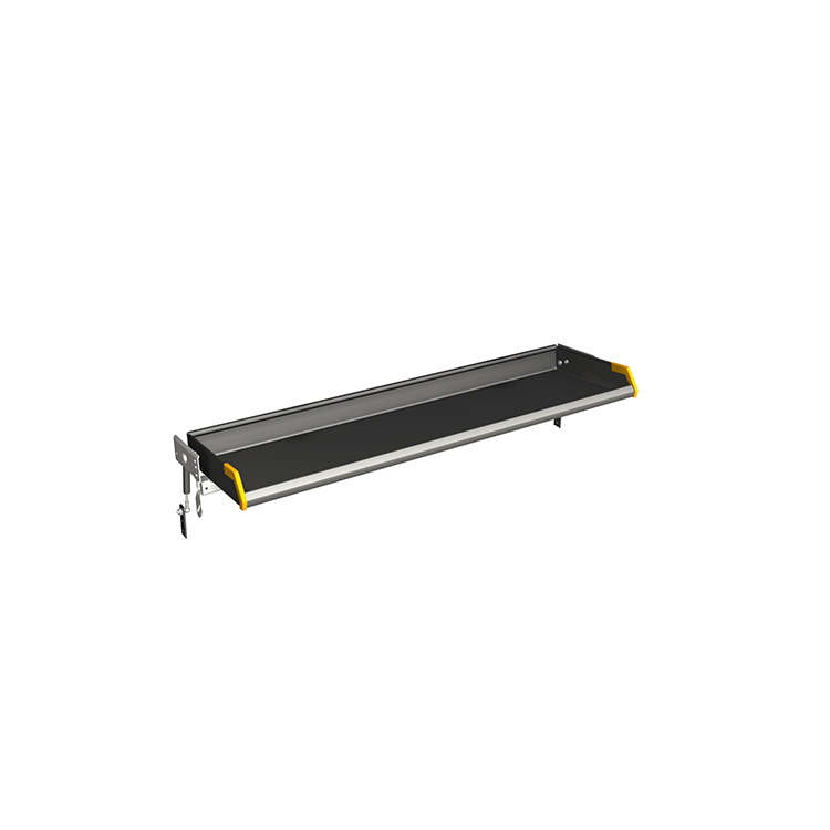 Les étagères rabattables sont disponibles en plusieurs longueurs pour d'adapter au différents modèles de véhicules. Pour faciliter leur utilisation, les étagères sont équipées en standard de vérins à gaz. La conception avec des cotés hauts et un rebord arrière permet d'améliorer le maintien des colis pendant le transport. Le rebord avant et spécialement conçu pour faciliter le déchargement. Chaque étagère a une capacité de charge de 120 kg, et peut être montée avec une inclinaison si nécessaire.