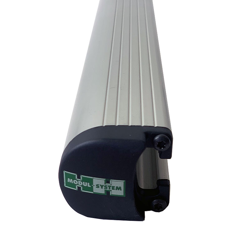 Barre de toit en aluminium haute résistance, livrée avec ses bouchons d’extrémité.