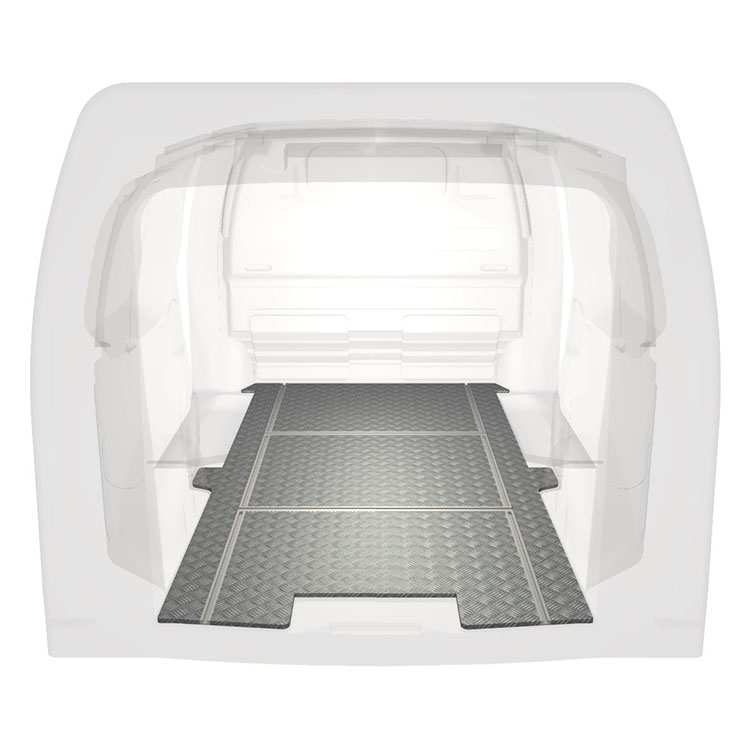 Plancher léger et robuste avec rails transversaux pour une Citroën Jumpy / Peugeot Expert / Toyota ProAce avec une plaque de roulement en aluminium antidérapant et des rails de chargement (longitudinaux et transversaux) pour une installation rapide et sûre des systèmes de rayonnage et autres accessoires.