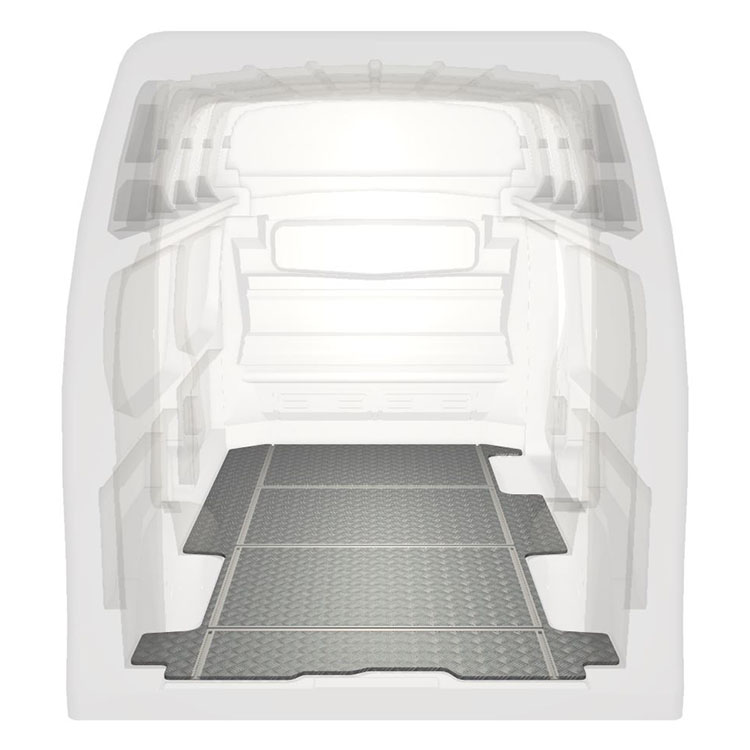 Plancher léger et robuste avec rails transversaux pour une Renault Trafic / Opel Vivaro / Fiat Talento / Nissan NV300 avec une plaque de roulement en aluminium antidérapant et des rails de chargement (longitudinaux et transversaux) pour une installation rapide et sûre des systèmes de rayonnage et autres accessoires.