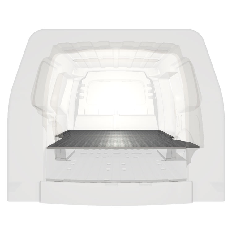 Double floor for a Volkswagen Caddy Cargo Maxi 2020-. The floor is designed to fit an extra-long drawer solution with one drawer unit 648x1296x270 and one 486x1296x270 coming out from the rear doors, and one drawer unit 486x1296x270 coming out from the side door.