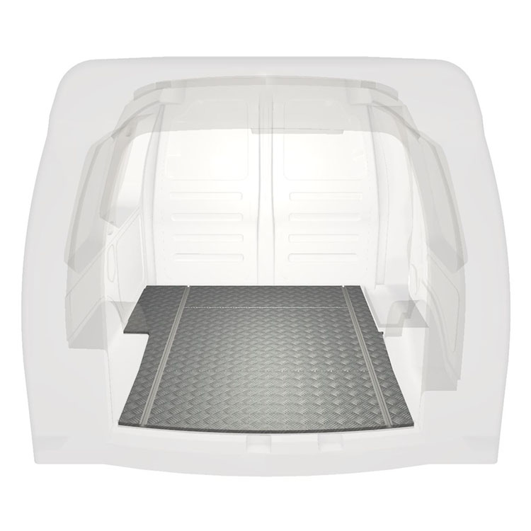 Plancher standard ultra-léger et robuste pour une Volkswagen Caddy avec une plaque de roulement en aluminium antidérapant et des rails de chargement (longitudinaux) pour une installation rapide et sûre des systèmes de rayonnage et autres accessoires.