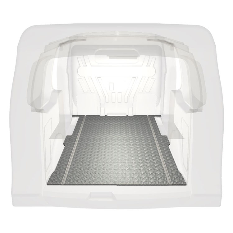 Plancher très long léger et robuste pour une Ford Transit Connect avec une plaque de roulement en aluminium antidérapant et des rails de chargement (longitudinaux) pour une installation rapide et sûre des systèmes de rayonnage et autres accessoires.