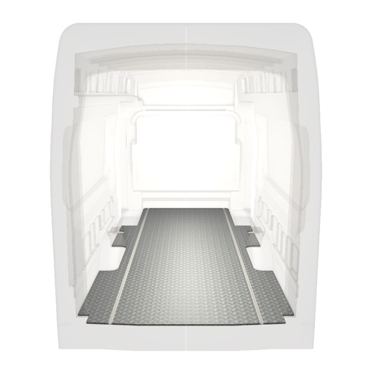 Plancher très long léger et robuste pour une Ford Transit avec une plaque de roulement en aluminium antidérapant et des rails de chargement (longitudinaux) pour une installation rapide et sûre des systèmes de rayonnage et autres accessoires.