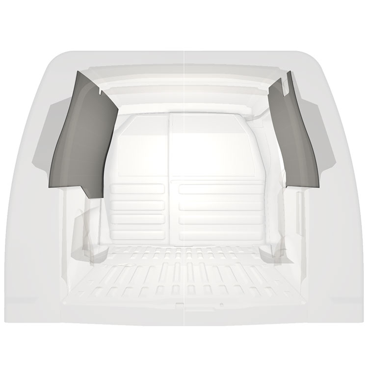 Revêtement entièrement léger pour parois intérieures d’uneCitroën Berlingo / Peugeot Partner avec une porte latérale à droite. Les revêtements créent un environnement professionnel lumineux et convivial et se nettoient facilement.