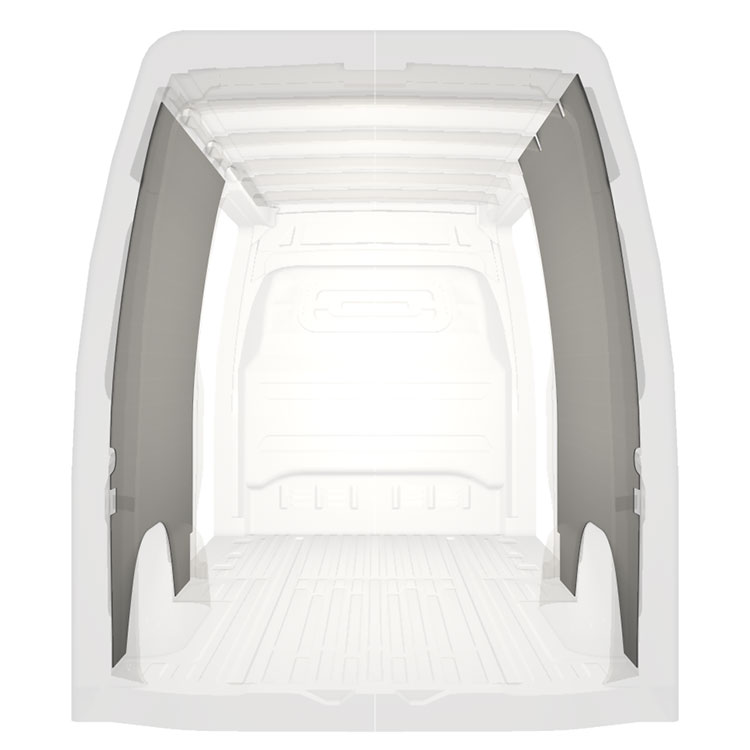 Revêtement entièrement léger pour les parois intérieures d’une Mercedes Sprinter avec doubles portes latérales. Les parois créeront un environnement professionnel lumineux et convivial et se nettoient facilement.