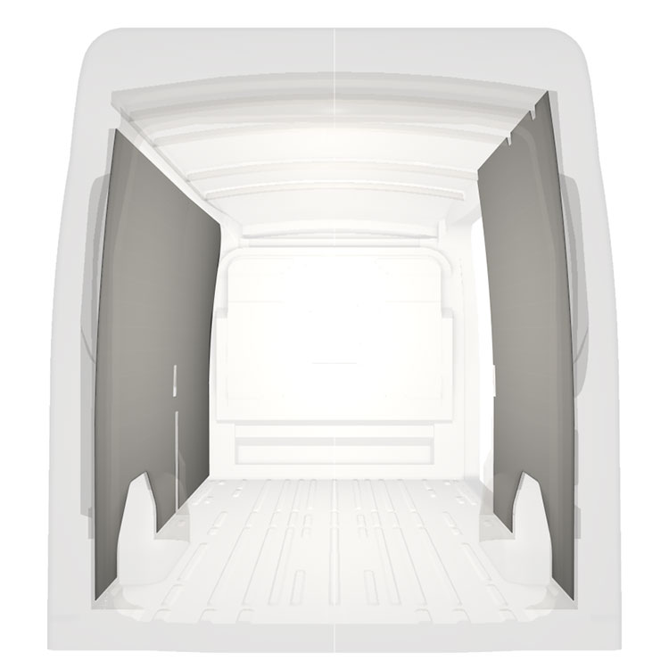 Revêtement entièrement léger pour parois intérieures d’une Ford Transit avec une porte latérale à droite. Les revêtements créent un environnement professionnel lumineux et convivial et se nettoient facilement.