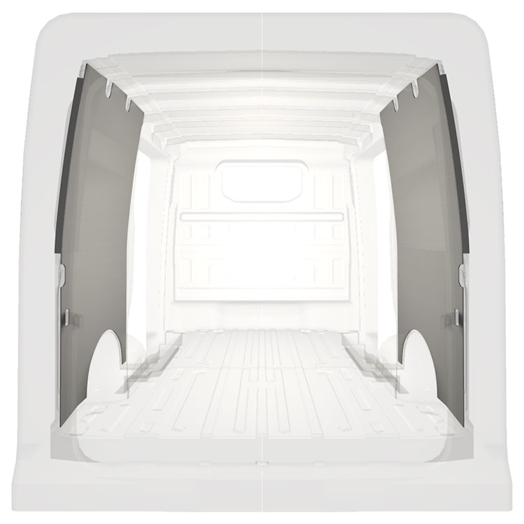 Revêtement entièrement léger pour les parois intérieures d’une Volkswagen Crafter / MAN TGE avec doubles portes latérales. Les parois créeront un environnement professionnel lumineux et convivial et se nettoient facilement.